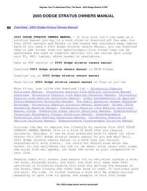 You know that reading 2003 Dodge Stratus Owners Manual Free is effective, because we can get too much info online from the reading materials. Technologies have developed, and reading 2003 Dodge Stratus Owners Manual Free books can be more convenient and much easier. We can read books on the mobile, tablets and Kindle, etc. Hence, there are many books being received by PDF format.